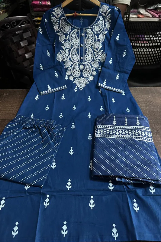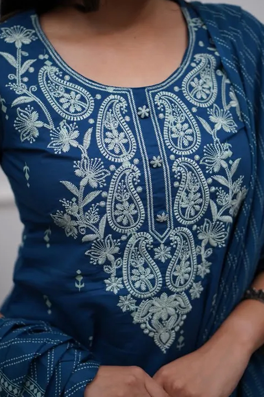 Americanchoice Blue Cotton Embroidered Kurta With Pant & Dupatta Set