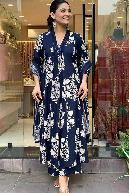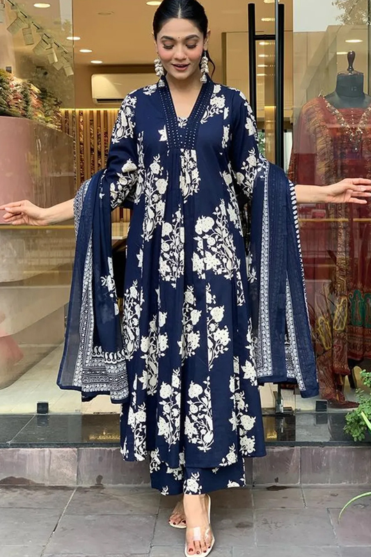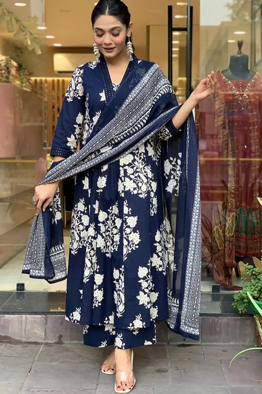 Americanchoice Cotton Navy Blue Printed Kurta With Pant & Dupatta Set
