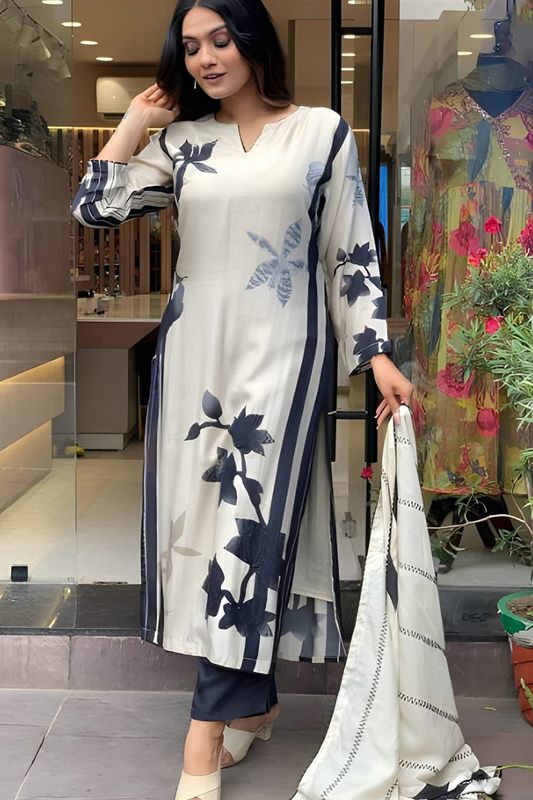 Be the first to review “Women’s White Printed Kurta Set with Rayon Pants & Dupatta”