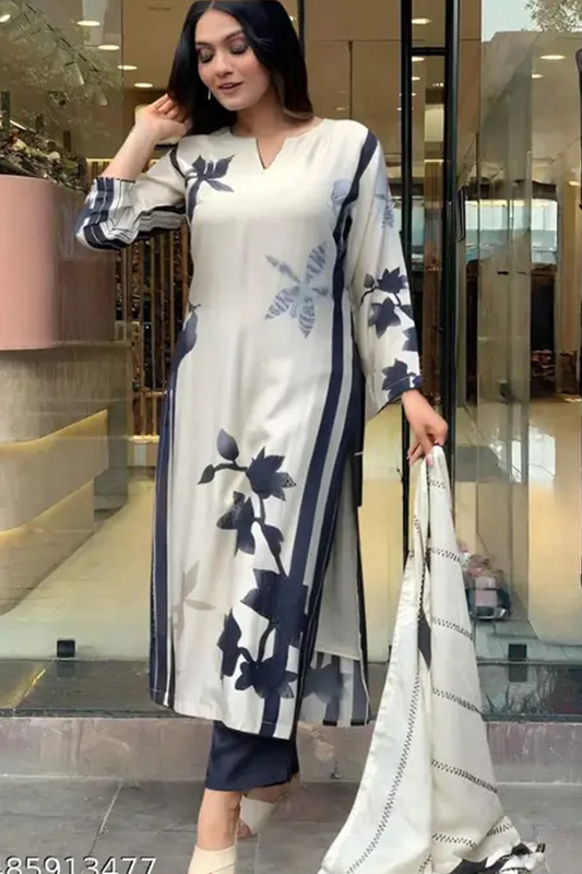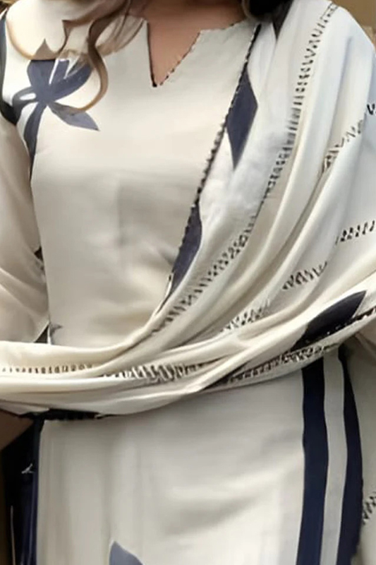 Women’s White Printed Kurta Set with Rayon Pants & Dupatta